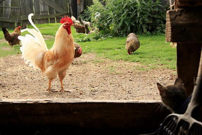 Немой диалог между петухом и котенком..., забавная сценка: петух на страже семейства,