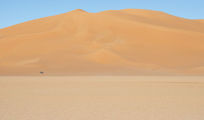 Тени исчезают в полдень. Про себя я назвал это место цирком. Обширный солончак в 5 футбольных полей, ровный как стол, окруженный высокими нетронутыми дюнами. Солнце падало почти вертикально. И - никого... |