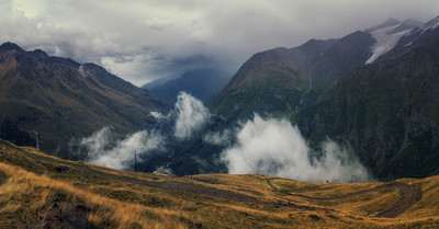 Снято на Чегете под дождём. В облаках, впереди, прячется Долина Нарзанов.