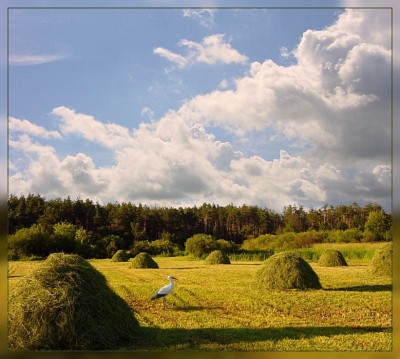 Несколько не нравятся краски.. Уж если буклет, то небо голубее, облака тенями проработать, чтобы придать им объем, стожки я бы просветлил, чтобы выделить, ну и выборочно пошарпить..