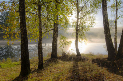 Тонкая вуаль тумана нежно окутывает золотисто-зеленые нежные березки...Искусное сочетание тонкой нежности и стремлением к яркой солнечной жизни...