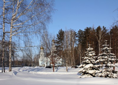 Зима в предместье Новосибирска. Тихий ясный день, пейзаж с видом на Храм с заснеженными ёлочками и берёзы.
