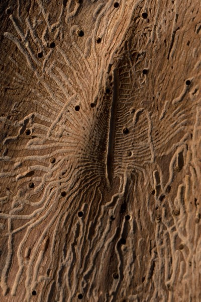 Ходы личинок жука-древоточца без коры