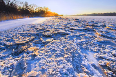 Последние лучи закатного солнца на скованной льдом водной глади реки...