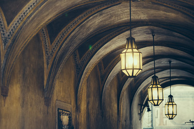 внутри карточки происходит индукция. Арки уходят, приводя взгляд к последнему светильнику, а тот приводит к первому, а потом и к ближайшей арке. И так по кругу)
