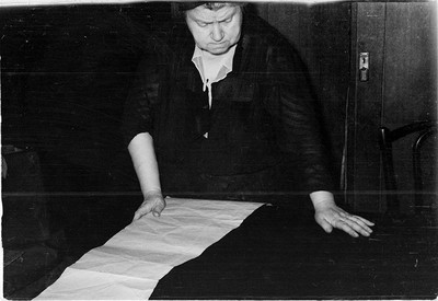 Из жизни одного человека. Патронка Бабка (все звали её между собой так) прекратила работать за три года до смерти в 1964г. На снимке - момент выкройки, лист бумаги - "патронка", т.е честёж, который потом вырезается по контуру и по контуру режется лоскут (вспомнил слово!). Снимок начала 1950-х годов. |