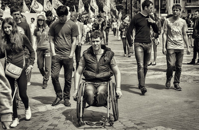Не собирался акцентироваться на кресле этого парня, наоборот, он мчал вперёд, других обгонял! Это ли не сила, это ли не вера в себя? Так же как в толпе никто особо перед ним не расступался. Согласитесь, стоило сделать кадр с ним. Я посчитал, нужно. Могучий парень, устремлённый! И первомай могучий! Надеюсь, Вы услышали мой посыл. |