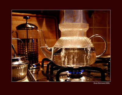 синее с золотом - это раз. И золотые нити в воде сквозь прозрачное стекло, золотая испарина на металлической части чайника - это мне два. И бонусом - столб пара.