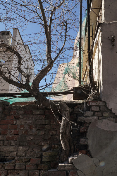 - колючая проволока переходит в ветки деревьев - всё та же S-образная линия Хогарта :-) - и подчёркивающий эту линию хороший свет в нижней половине снимка. Та, что в описании, ценна "смыслом", проросшими сквозь стену корнями (стволами), но фотографически она "сырая", не доведённая до цельности и визуальной эстетики. |