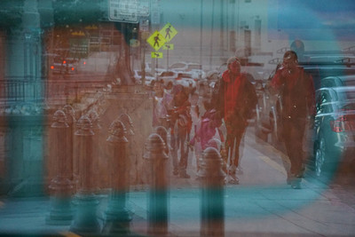 Снято под углом сквозь двойное стекло витрины плюс отражение поручня лестницы зелёного цвета и прочие вкрапления отражений улицы.
