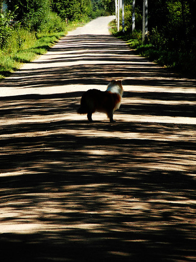 Снимок постановочный. Сначала идея, потом много попыток поставить собаку в нужное место поперёк дороги, а вот голову пришлось приделать из другого снимка...