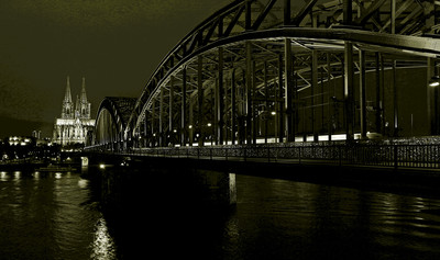 Без названия Мост Гогенцоллернов (нем. Hohenzollernbrücke) — стальной арочный железнодорожный мост через реку Рейн, расположенный на расстоянии 688,5 км от истока в крупнейшем городе федеральной земли Северный Рейн-Вестфалия — Кёльне (Германия). Вместе с расположенными у разных концов моста вокзалами Кёльн и Кёльн–Мессе/Дойц является одним из важнейших железнодорожных узлов в Европе. В сутки по мосту проходит более 1200 составов. Мост Гогенцоллернов расположен в непосредственной близости со знаменитым Кёльнским собором и наряду с ним является визитной карточкой города. |