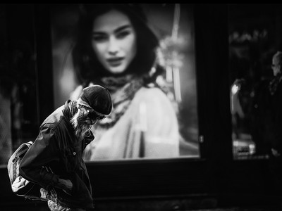 Lana Medved 123, хорошо, Света, тогда продолжу)). Вот я смотрю на превью эту картинку, просто когда открываю - великовата, приходится уменьшать - и вижу такие треугольники, что ли. Вот девушка на афише смотрит - и направление её взгляда такое косое, пересекающее чёрную вертикаль рамы справа. Мужчина смотрит чуть более вертикально, но тоже косо. И эти линии как бы не видны, но присутствуют на фото. И ещё - хорошо и правильно, что нижняя горизонтальная часть рамы слегка наклонна.