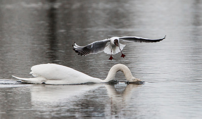 Чайка отгоняет шипуна от гнезда с самкой.
