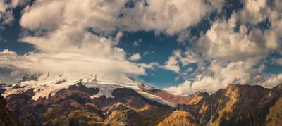 Эльбрус, вершины в облаках.Снято с горы Чегет.Сентябрь, Приэльбрусье, КБР.