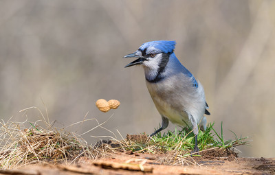 Blue jay~Голубая сойка Размер голубой сойки составляет около 30 см, а размах крыльев насчитывает около 42 см. Её вес составляет от 70 до 100 г. Характерным признаком является голубая спинка, короткий синий гребешок, чёрное ожерелье, сине-чёрно-белый узор на крыльях и чёрно-белый полосатый хвост. Голубые сойки ведут моногамный образ жизни и остаются верны своему партнёру на протяжении всей жизни |