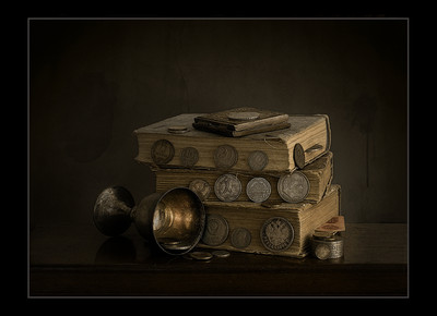 Честно говоря не понял. Тщательно раставленные монеты, книги, бокал. Может кто просветит? Оценку не ставлю, ибо не понял.
