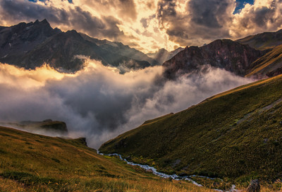 Закат в Баксанском ущелье не далеко от Терскола и водопада "Девичьи косы".