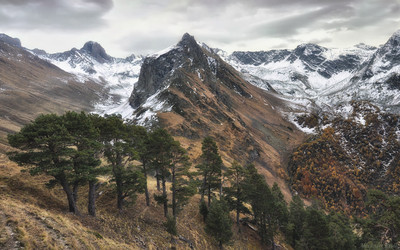 Говорящие с ветром... Карачаево-Черкессия, октябрь. Гора Шхуанта в верховьях речки Загеданки, притока Большой Лабы, и её окрестности. Здесь, на высоте около 2500м растут эти красивые сосны, вгрызаясь корнями в скалы под тонким слоем почвы, наперекор всем тяготам своей судьбы - сильным ветрам, недостатку влаги и продолжительной зиме. |