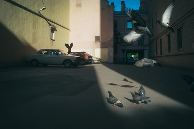 дальний голубь - сдаётся), руки вверх)), то есть - крылья, свет как если - от фар, треугольником. Нет, я понимаю, что солнце. И очень красивые правые голуби разлетающиеся - этими освещёнными перышками.