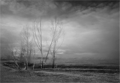 8ele8, ладно тогда) - продолжим)). Про облачка на горизонте, про лес там же - то светлый, почти намёком, то чуть плотнее. И - может неправильно нравится, но нравится, что деревья не по центру, а сбились влево, а справа - простор. Мерцающая картинка.