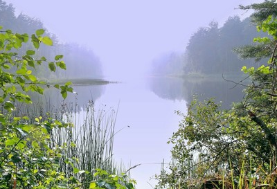 Alex-55-boy После дождя Парит, жара! После прошедшего прохладного дождя, тёплая вода в озере, словно парное молоко, стала покрываться белесой пеленой в сочетании с красками озера, леса и солнца.