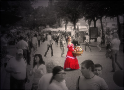 Она и так идёт против течения, она и так иначе одета, она одна с корзиной цветов, она и так заметна. Зачем её красным выделили? Всё испортили. Фигня получилась.
