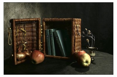Провалы в тенях. Вазочка - лишняя и по содержанию, и по форме. Лук также ... Яблоки не на месте. Слишком контрастный свет. Всё ИМХО.