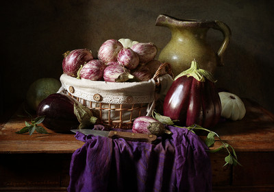 баклажаны в корзинке, зеленый кувшин