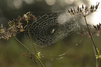 Паутинка с пауком в туманном утре и росе