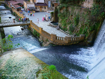 У водопада. Одной из главных достопримечательностей Абхазского города Новый Афон считается искусственный водопад, находящийся в центре города. Его судьба непосредственно связана с Новоафонским монастырем, который был основан русскими монахами в 1875 году и является одним из самых больших культовых сооружений Кавказа. У этого водопада довольно интересная история. Он образовался в 1882 году при возведении арочной плотины, тогда монахи начали строить Псырцхинскую ГЭС на заболоченной и заросшей кустарником реке Псырцха. В то же время образовалось и небольшое водохранилище – озеро Псырцха, в котором разводили зеркальных карпов. |