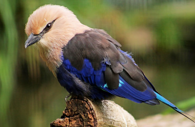 Без названия Синебрюхая сизоворонка величиной приблизительно с галку. Длина тела составляет от 28 до 30 см, включая хвостовые перья длиной 6 см, длина крыльев составляет от 16 до 19 см. Вес птицы составляет от 110 до 178 г. Самцы чуть больше чем самки. Спина тёмно-зелёного цвета, относительно крупная голова кремового цвета, затылок, грудь и большинство оперения преимущественно ультрамаринового цвета. У взрослых птиц на вилочковом лазурного цвета хвосте имеются полосы длиной 6 см. Надклювье слегка согнуто на конце вниз. Половой диморфизм не выражен. Цвет оперения интенсивнее у взрослых птиц чем у молодых птиц. Со скоростью от 3-х до 5-и звуков в секунду птица издаёт приблизительно 5 секунд сухой, сжатый звук «га-га-гаа-га». Призыв похож на призыв африканского широкорота, у которого он немного короче. |