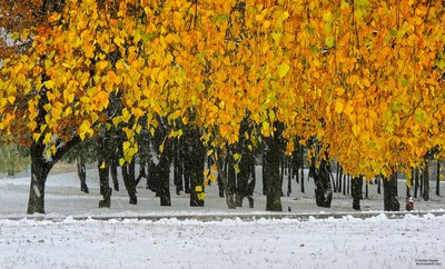 снегопад на окраине Гомеля 2 ноября 2016 года. Еще желтые листья берез