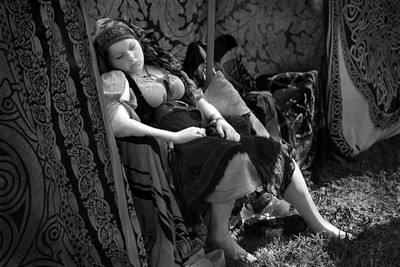Полуденный отдых... Ежегодно в Калифорнии проводится праздник "Ярмарка "Ренессанс". Народ наряжается соответствующе, кто как сумеет. Иногда очень изобретательно! То-то раздолье для фотографа! Сделала много интересных снимков. Конечно в цвете. Но потом, подумав, перевела в ЧБ. |