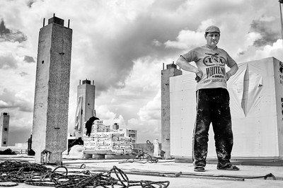 13 й этаж. На стройке сложно фотографировать, обычно туда даже не попасть, однако обстоятельства порой складываются иным образом. На фото человек, делающий работу команды промышленных альпинистов беспрерывной. Следящий за ситуацией наверху, где находятся точки крепления страховочных и основных веревок. Именно он, пожалуй, самый ответственный человек на высоте в пол сотни метров. Такой вот жанровый портрет... |
