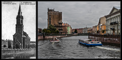 Два Петербурга. До 1929 г. здесь находилась Немецкая реформатская церковь. В 1932-1939 гг. он по проекту арх. П. М. Гринберга и Г. С. Райца перестроен в здание Дворца культуры работников связи. Здание в стиле конструктивизма построено с использование существующих стен. |