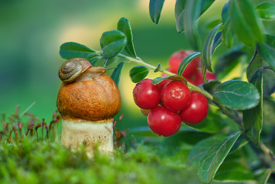 Выглядит несоразмерно брусника на фоне гриба и улитки. Плюс вопрос с размытием: использовали программное размытие?