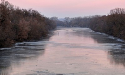 Солнце почти спряталось за горизонт, но на противоположной стороне розовый цвет осветил небо и отразился на зеркальном льду реки.