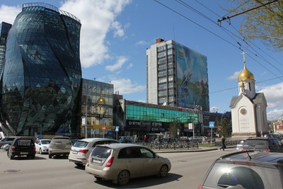 Экстерьер Красного проспекта у часовни. Часовня св.Николая в центре города Новосибирска относится к известным памятникам архитектуры, долгое время она символизировала Центр страны.Во втором десятилетии 21 века место модернизировано строительством новых зданий с современной архитектурой и интерьером. Зонтики предыдущего фото, располагаются на террасе дома Бутон. |
