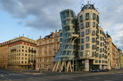 "Джинджер и Фред" Здание состоит из двух башен цилиндрической формы, одна из которых изгибается, и как бы напоминает танцующую пару, имеющую даже шутливое название среди пражан "Джинджер и Фред" ( в честь пары Джинджер Роджерс и Фред Астер). Необычный дизайн, конечно же контрастирует и выделяется среди построек конца 19-ого начала 20-ого веков. |