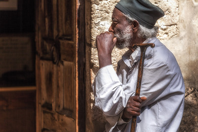 Храм Гроба Господня. Иерусалим, 2015г. На входе в Абиссинскую часть Храма. Священник Эфиопской православной церкви...