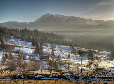 Вечерний вид в направлении на г. Петрос со склонов гор вблизи села Лазещина (Закарпатье)
