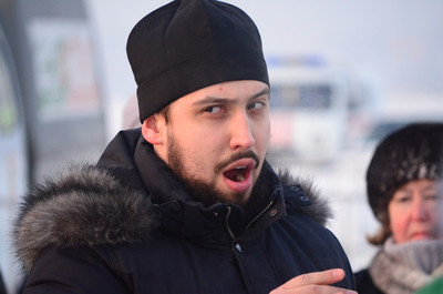 служитель культа проводит церемонию освящения проруби для крещенских купаний