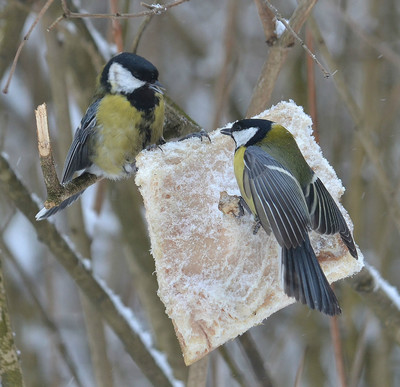 У большой синицы поза угрозы - немного расправленные крылья, приоткрытый клюв и вздыбленный загривок.
