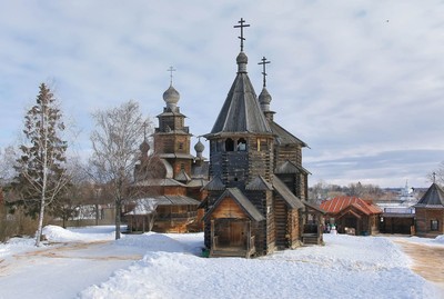Воскресенская и Преображенская церкви в музее деревянного зодчества Суздаля.