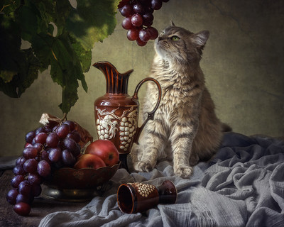 Taabu, на поверите: делала натюрморт совсем не кошачьей темы. Масяня устроила мне вырванные годы, стягивая все со стола - фотографируй ее. Вот я и пошла у нее на поводу: хочешь, на тебе виноград! Потом думаю:" Да это же иллюстрация басни Крылова!"