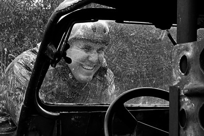 Штурман застрявшей в болоте машины, пытается достать лебедочный трос...