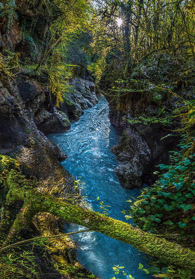 Абхазия. Субтропический лес весной, время съёмки — середина апреля. Река Бзыб такого цвета из-за талого льда в горах.