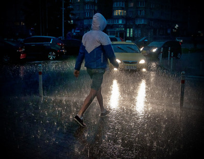 Интересно! Видно, что дождь был сильный, но парню нипочём