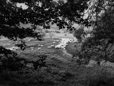 Овцы пасутся за листьями в Монтефолонико зимой 12013